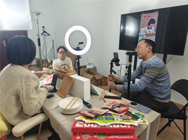 在产品升级上,园区紧扣市场趋势,结合本土农品特性开展研发升级,助力友盛蔬菜食品厂革新产品,升级沙地萝卜干等经典农品的形态与包装,让乡土特产提升附加值、贴合消费需求。此外,园区整合本地十余种特色农品,拓展明康汇、许鲜团等社区团购渠道,成功搭建了“基地直采+市场分销”供应链体系。自开园以来,园区累计开展专场直播150场,全网曝光7000万人次,2025年电商产业园销售额超4000万元,切实破解农产品“卖难、价低”难题。