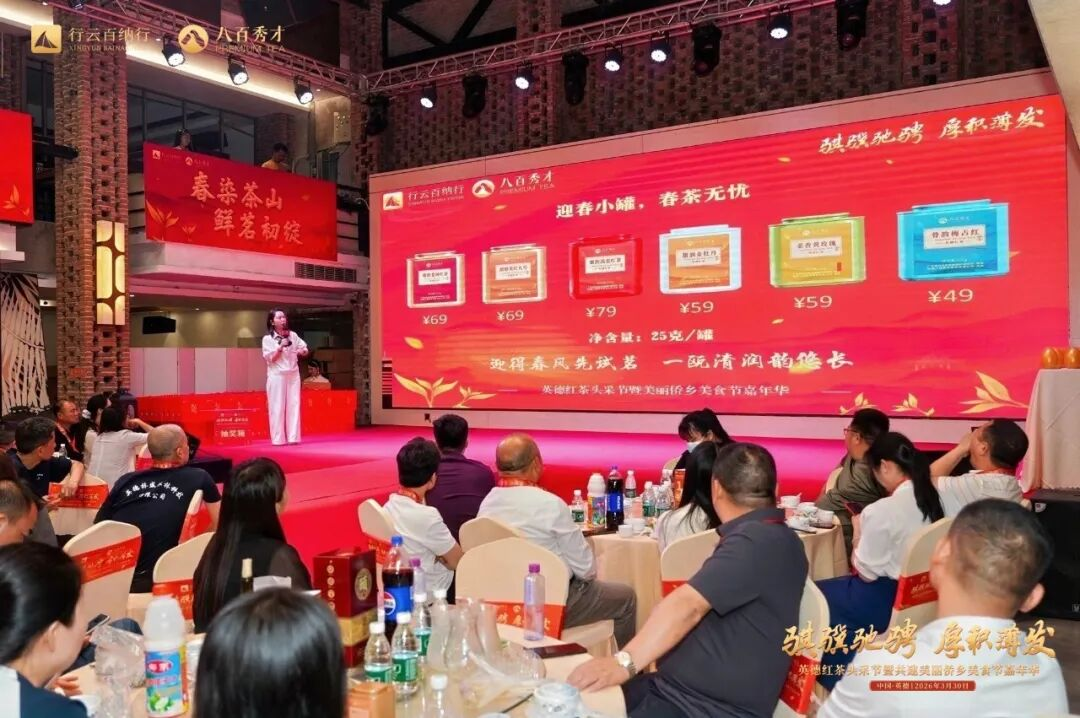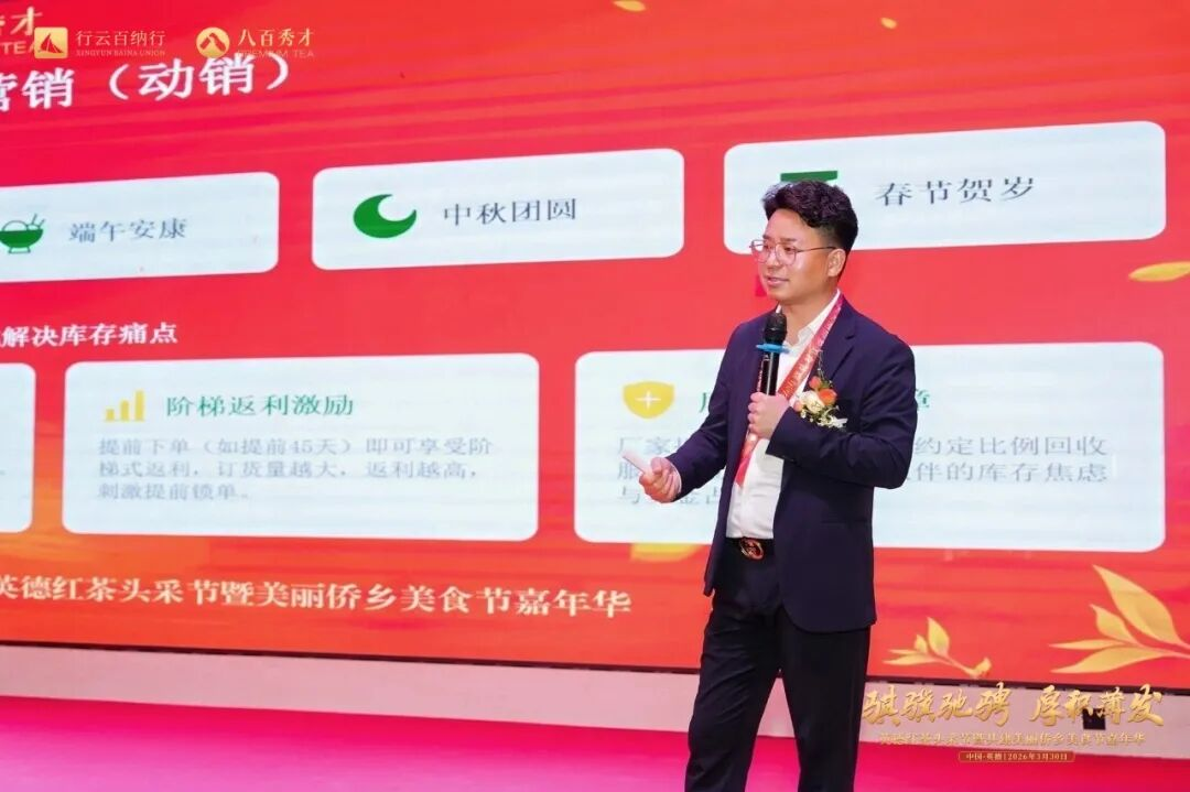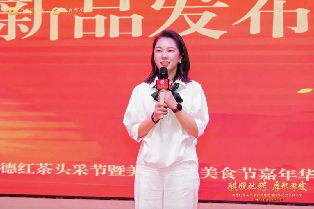 副总经理田民俊带来多款升级及经典产品发布,头春系列金英红、金牡丹,春风十里系列英九、老树红茶,迎春系列大罐、小罐等精品依次亮相。结合专业讲解与雅致音乐的新品走秀,全方位展现八百秀才英德红茶的上乘品质与多元魅力,赢得现场阵阵赞誉。